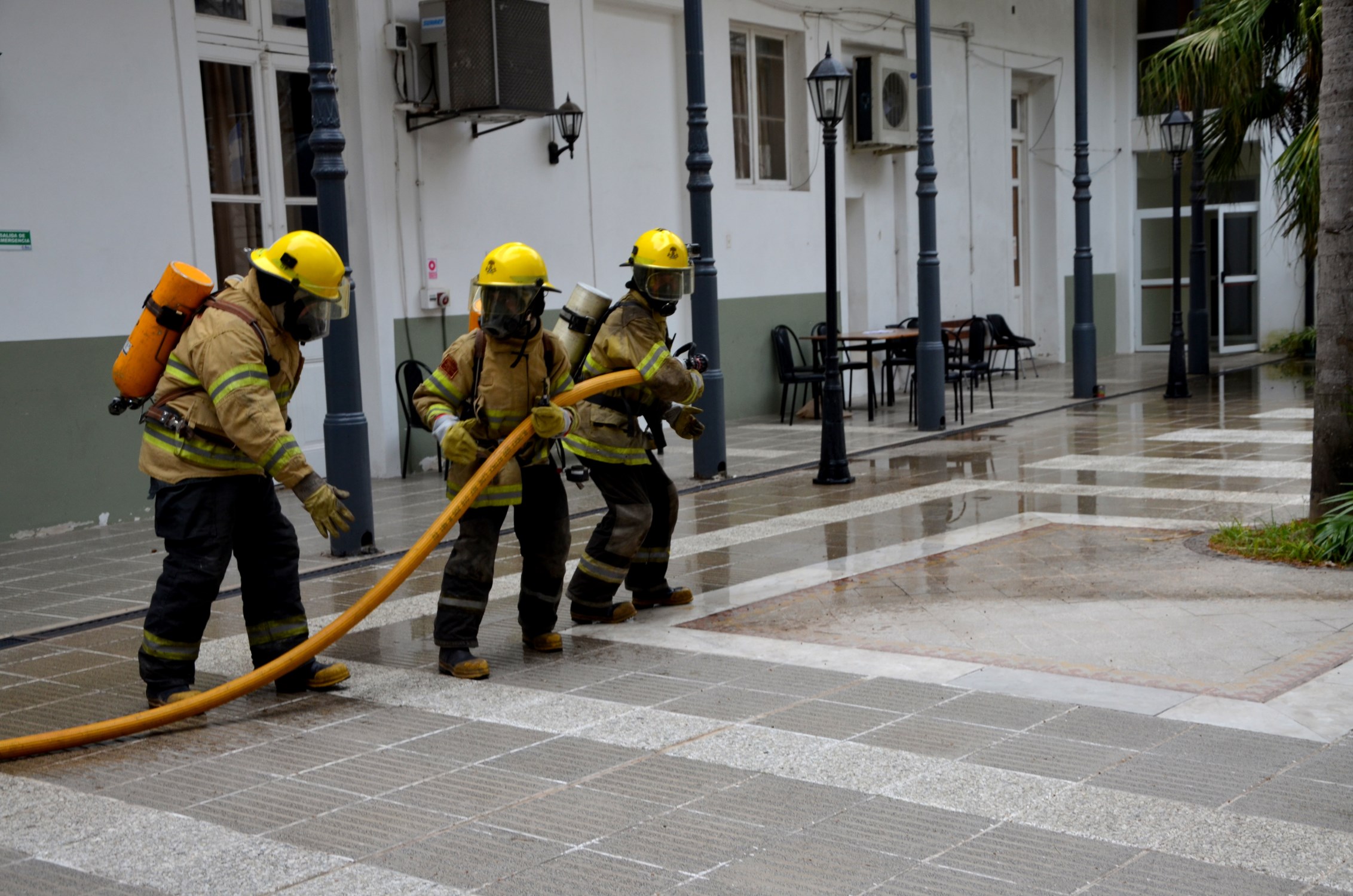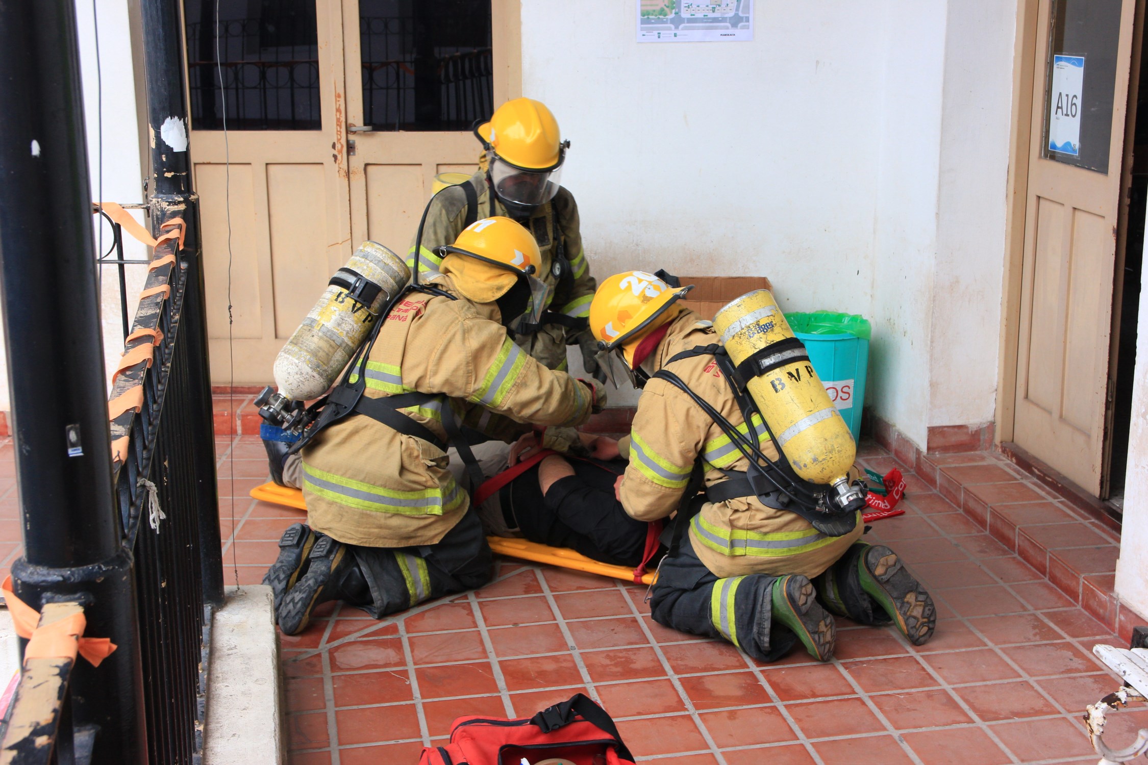 Luego de que los bomberos voluntarios entraran a la Facultad con el procedimiento debido en caso de una situación de emergencia, se realizó también el simulacro tanto de comunicación entre bomberos y personal de la brigada de evacuación acerca de cantidad de heridos y/o desaparecidos en un siniestro. Además, se realizó un rescate en camilla con un voluntario de la Facultad, realizando el trabajo indicado si hubiera una situación de tal tipo.