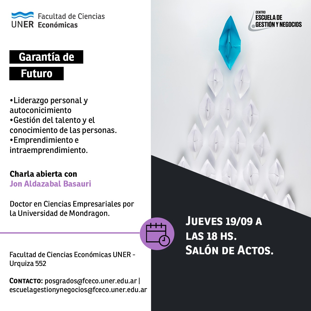 Se realizará la Charla Abierta «Garantía de Futuro«, organizada por el Centro Escuela de Gestión y Negocios de la Facultad de Ciencias Económicas de la UNER.