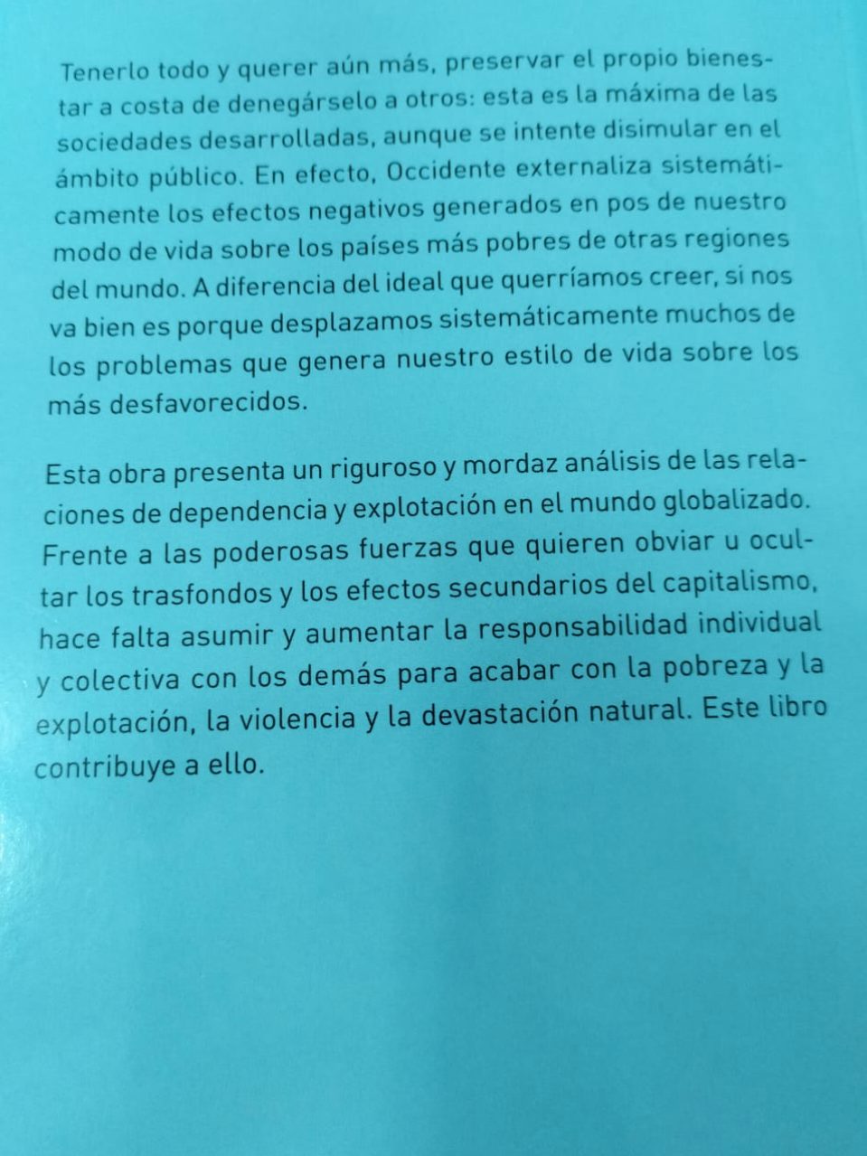 Esta obra presenta un riguroso y mordaz análisis de las relaciones de dpendencia y explotación en el mundo globalizado. Frente a las poderosas fuerzas que quieren obviar u ocultar los trasfondos y los efectos secundarios del capitalismo, hace falta asumir y aumentar la responsabilidad individual y colectiva con los demás para acabar con la pobreza y la explotación, la violencia y la devastacion natural. Este libro contribuye a ello