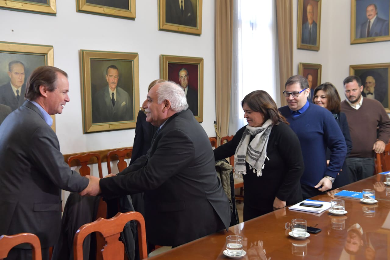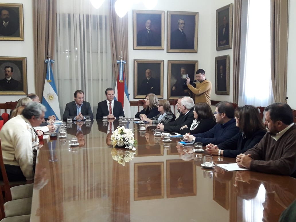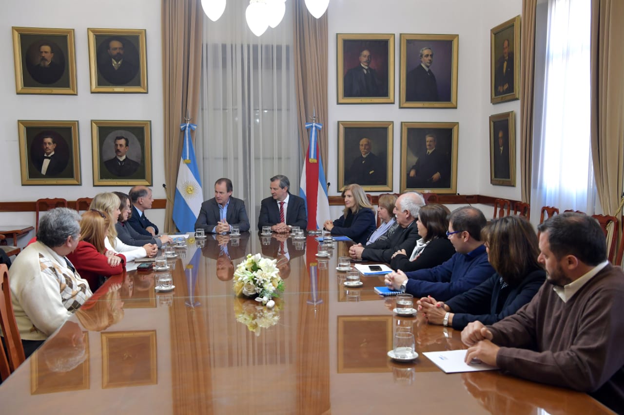 El rector de nuestra Universidad, Cr. Andrés Sabella y la Vicerrectora, Dra. Gabriela Andretich, en compañía de representantes de las nueve Facultades de la UNER, se reunieron esta mañana con el Gobernador de Entre Ríos, Cr. Gustavo Bordet, el ViceGobernador, Adán Bahl y la Ministra de Gobierno, Rosario Romero.